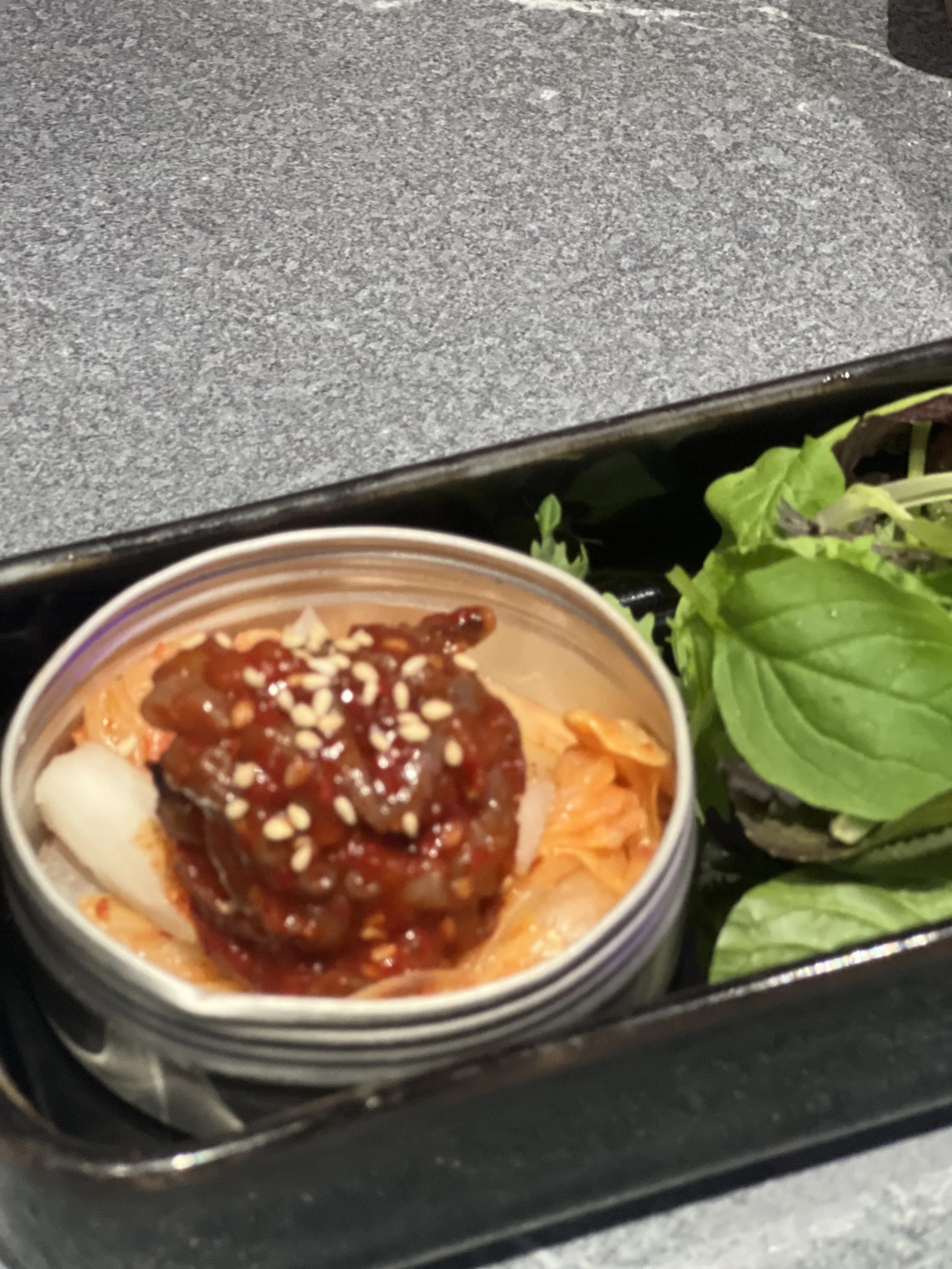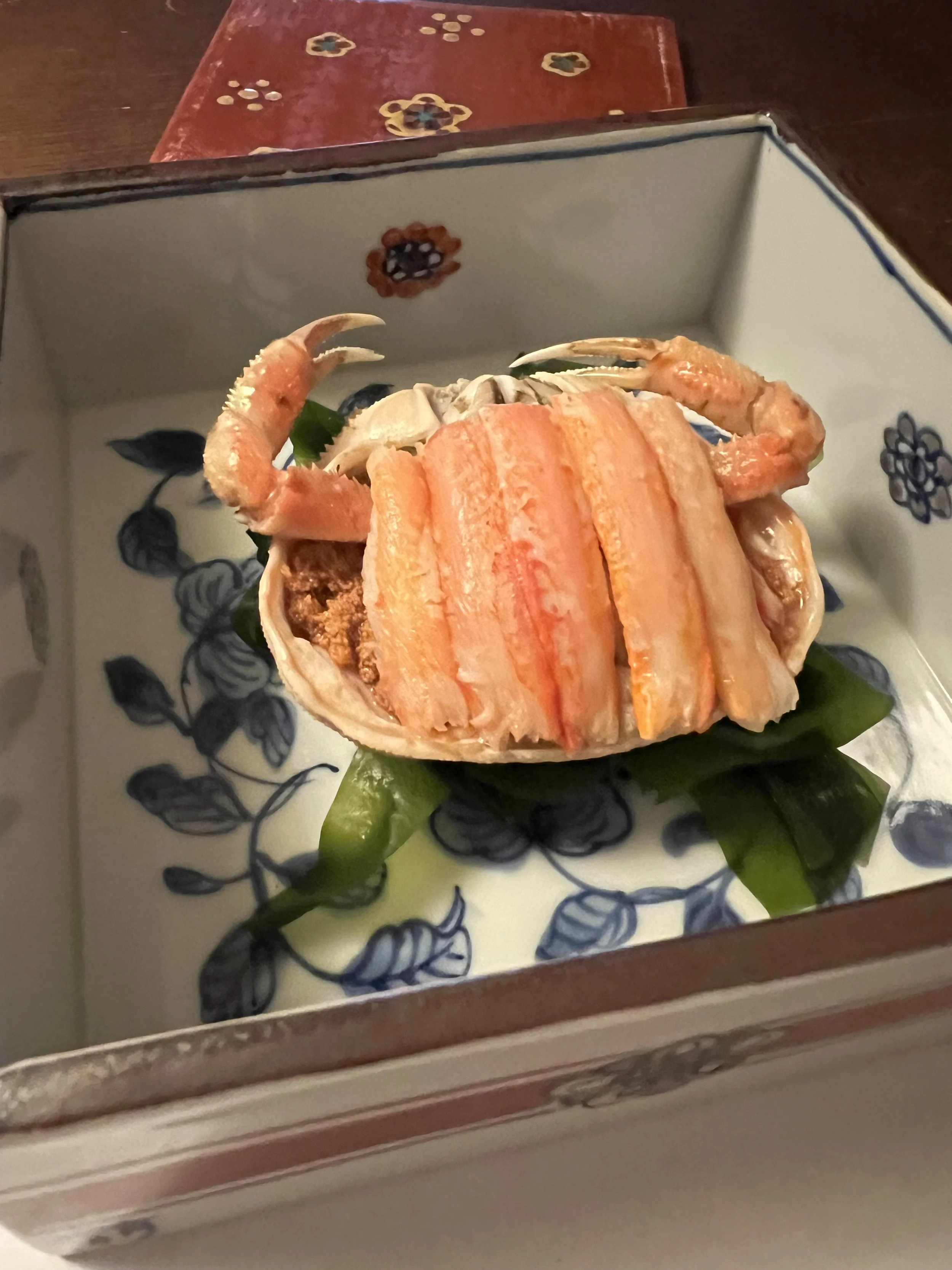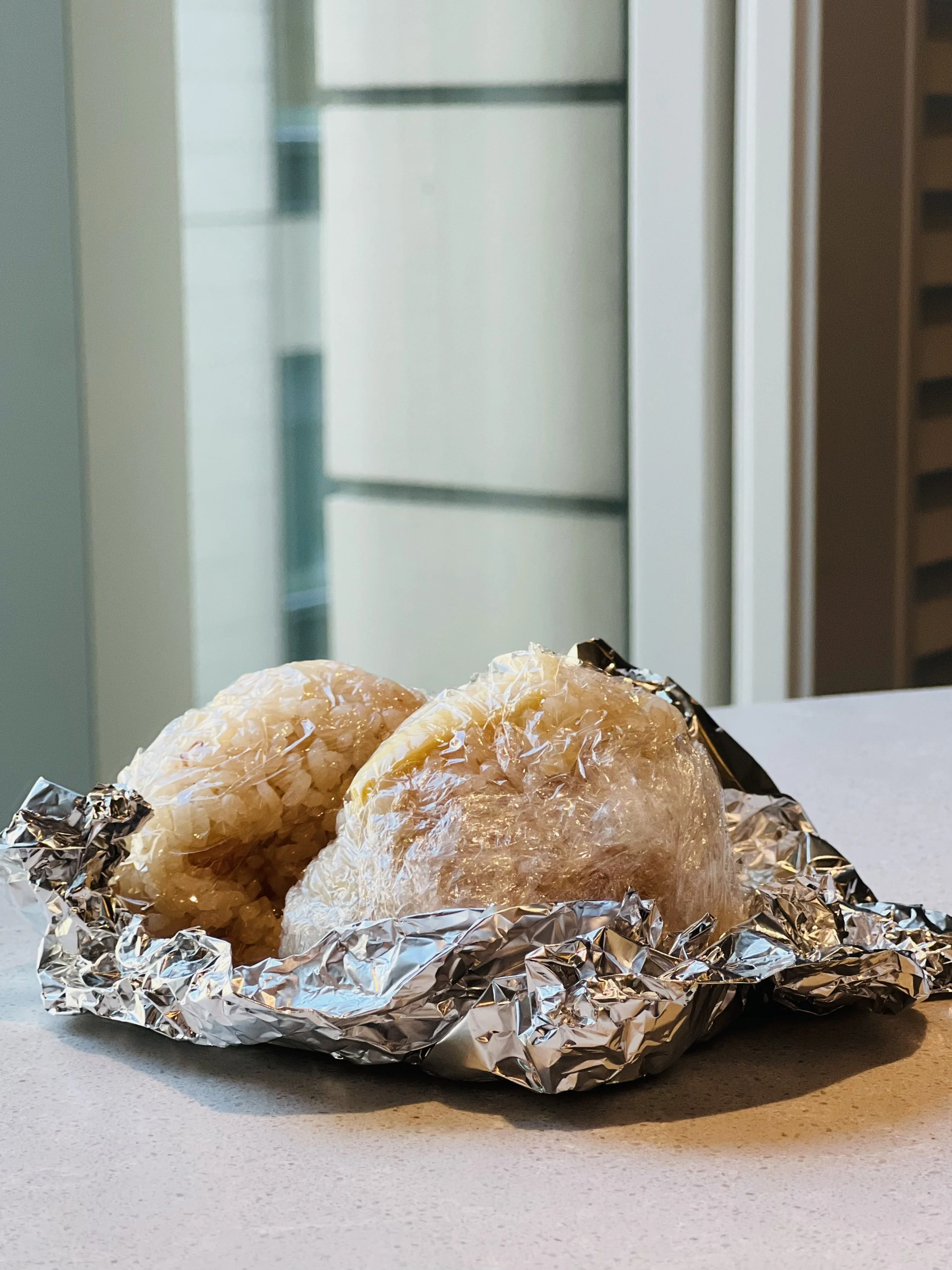 我突然想到前一陣子跟朋友去日本玩,朋友宴請了一頓高級無菜單料理。日本人的習慣都是在尾聲送上澱粉,這土鍋煮的炊飯非常美味,無奈肚子已經裝不下。主廚很貼心的做成飯糰讓我們帶回。