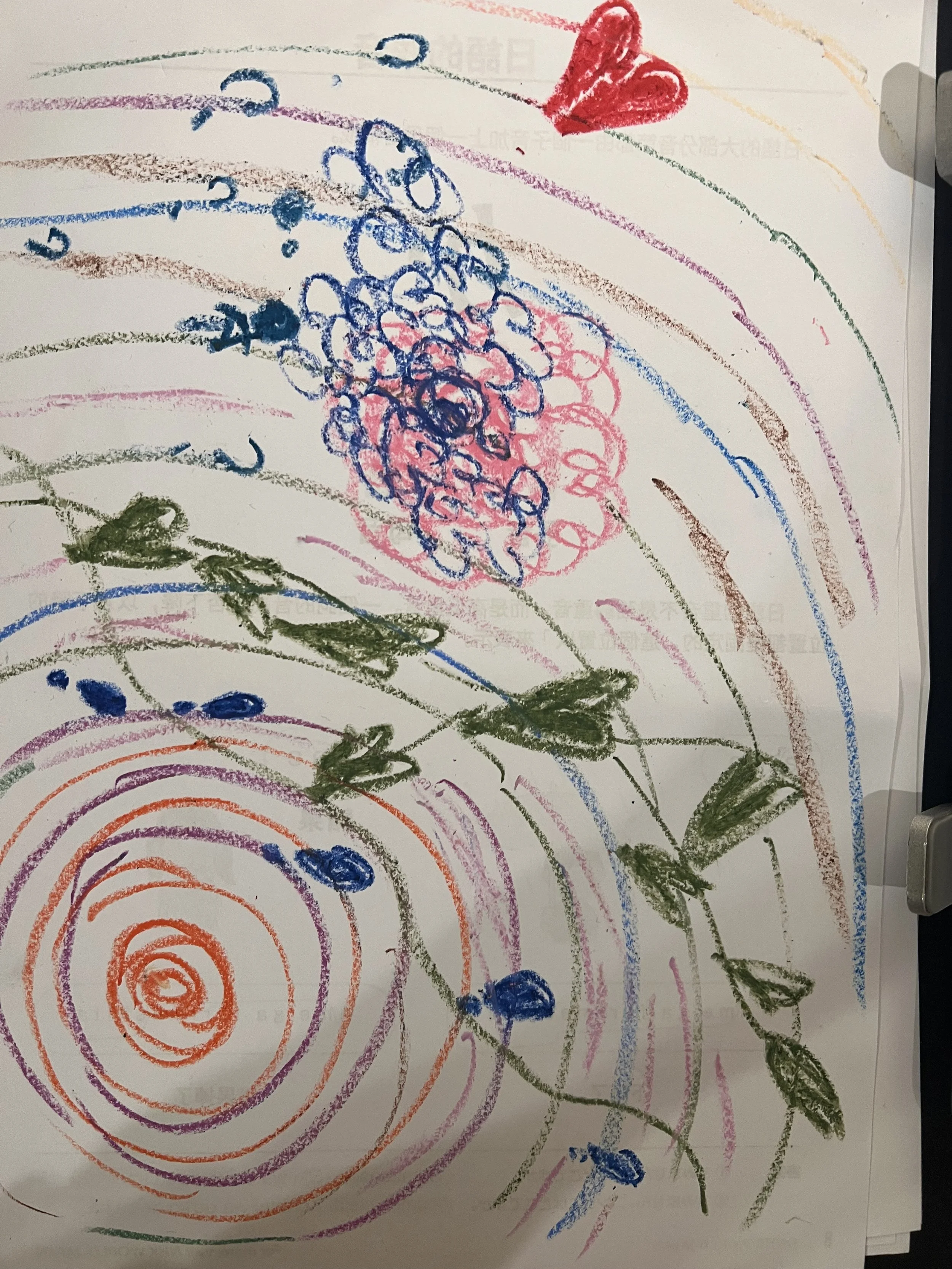 有人畫了一顆被綠色包圍的心,藍色與紫色層層交疊,旁邊寫著「回到自己的感覺」,像是在提醒自己:界線、包覆與安全感。